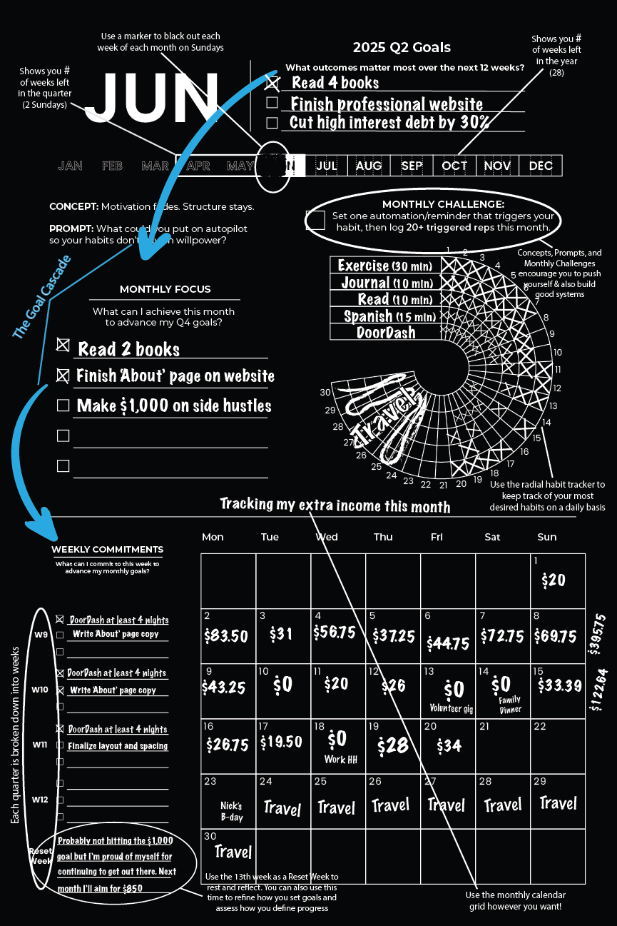 A real snapshot from my calendar on June 20th, 2025 — weekly goals, daily habits, DoorDash income, and some light reflection, completed intentionally before travel.